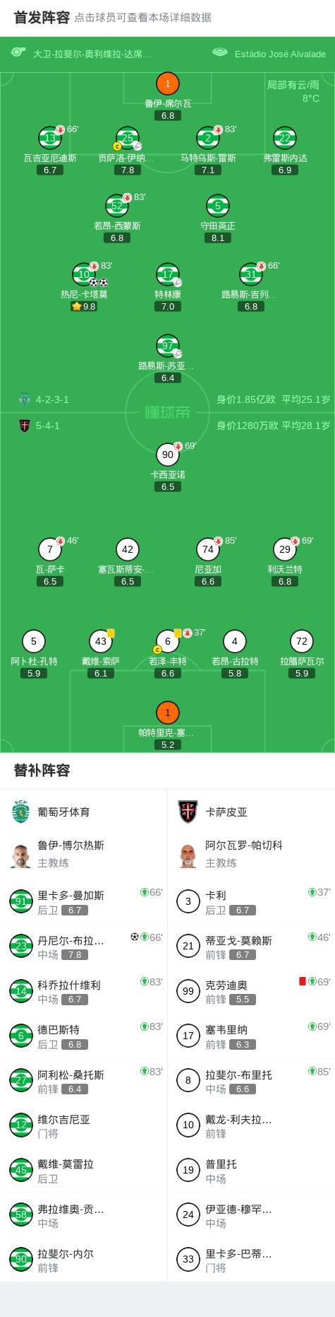 第38分钟,葡萄牙体育球员特林康助攻热尼-卡塔莫打入一球。